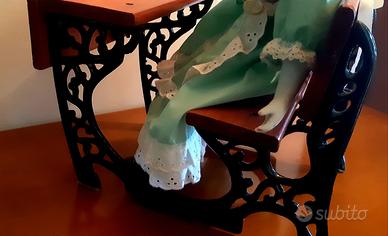 Deliziosa bambola antica, in porcellana e stoffa, vestita da scolaretta di un tempo, con abito e grembiule verde rifinito con prezioso pizzo sangallo