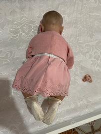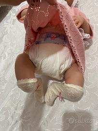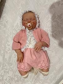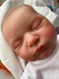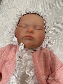 Bambola Reborn in vinile morbido e corpo in stoffa, modello Laura di Bonnie Brown dipinta a mano; la bambola ha un aspetto molto reale e si possono vedere in foto i dettagli di vene e rossori e le unghie delle manine e dei piedini. Viene spedita già vestita e con accessori come ciuccio magnetico e biberon. Oggetto da collezione per collezionisti. Prezzo non trattabile