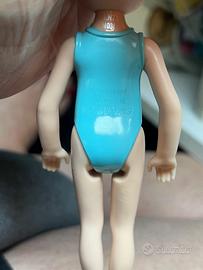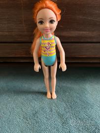 Mini bambola tipo sorellina di Barbie (Skipper/Stacie/Chelsea), con lunghi capelli rossi raccolti.