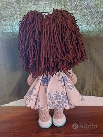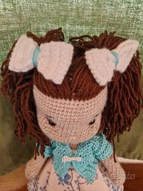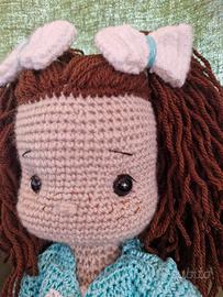 Bambola realizzata all'uncinetto fatta interamente a mano,anche vestiti e scarpe. - Capelli castani lunghi. - Vestito con fantasia floreale azzurra. - Bolerino azzurro. - Fiocchi bianchi sui capelli. - Ideale anche come regalo. - Altezza 36cm.