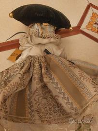 bambola vintage in porcellana con prezioso abito damascato e cappello in velluto imbottito . ottime condizioni . marca Claudia