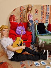 Questo è un set che comprende due bambole (Barbie e Codi), un divanetto in legno con scompartimento, una poltrona in stoffa con cassetto, sedia, piatti e altri oggetti che arredano una vera casa. Tenuto tutto in buone condizioni. La macchinina, invece, non gode di buone condizioni.