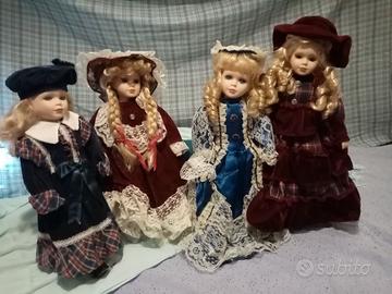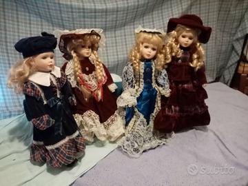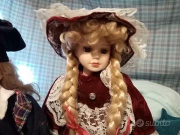 Vendo bambole di porcellana e tessuto, alte 30/40 cm, vestito e stile classico. Particolari accurati come le ciglia applicate e accessori. Condizioni ottime. Con supporto per tenerle in piedi. €12 l'una. Anche solo in visione per chi abita in zona. Vendita separata
