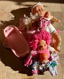 Bambole varie vintage N 6 Le due piccole hanno vasca bagno e 4 vestitini intercambiabili, il bambolotto più grande é senza vestito ma spingendo davanti piange, poi c'è capelli rosa, e l'altra ha mani con velcro per poterla attaccare. Vendo in blocco.
