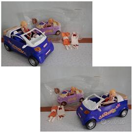 Bambolina con codina bionda risalente ai primi anni del 2000 che guida un'automobile Pretty Lovely Car con segni del tempo vicino alla parte posteriore che si possono vedere su alcune foto.