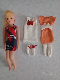 La bambolina è in plastica molto leggera e tenera tant'è che ha una gamba completamente staccata dal bacino che infatti tiene a pressione grazie all'abitino molto aderente e un ginocchio con le rughe perché è sempre seduta nell'auto.