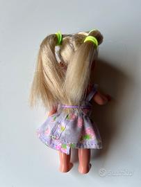 Bambolina originale marca Simba, ideale come amica o sorellina per Barbie. Alta circa 11 cm, con capelli biondi legati in codini e vestitino lilla con fantasia di fragole rosa. In buone condizioni generali, usata ma ben tenuta. Perfetta per giochi di ruolo o da collezione.