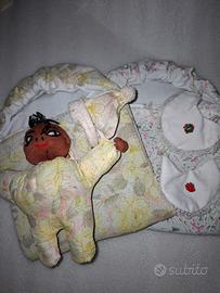 bambolotto realizzato interamente a mano in kenya. In dotazione anche 2 culle in tessuto, cappellino e 2 bavaglini.