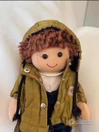 Bambolotto marca My Doll, nuovo con etichetta, altezza cm 27, incluso sacchetto in tessuto e piedistallo, materiale in tessuto, capelli in lana, abito removibile, giubbotto tecnico con cappuccio, salopette blu in velluto liscio, prodotto artigianale, lavorato a mano, bambola da collezione , molto carino ed ottima qualità