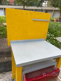 Vendo banco per gli attrezzi giocattolo per bambini. Il tavolo è fatto in legno autocostruito. Insieme al tavolo vengono forniti degli attrezzi in plastica per giocare. Il tavolo presenta un banco da lavoro con 3 cassetti per riporre gli attrezzi. Per info o altre foto scrivete pure ☺️ A causa delle dimensioni non spedisco. Consegna a mano in zona Casalecchio di Reno