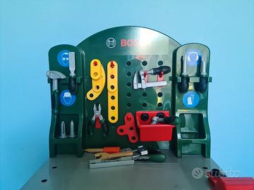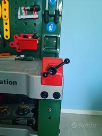 Tavolo da lavoro marca Bosch dotato di numerosi accessori e offre numerose possibilità di gioco e funzionalità. Sono presenti cacciavite e chiave inglese, pinze, lima, martello, sega, livella e molti altri utensili giocattolo morsa da banco e scaffali di stoccaggio. Il tavolo è completo di tutti gli attrezzi ed in ottime condizioni (no graffi, ammaccature o bolli) usato pochissimo