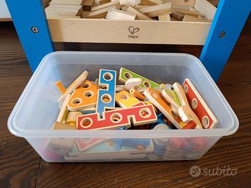 Banco da lavoro per bambini con legnetti e meccano di legno con viti di plastica per giocare. Ottimo stato, non posso spedire.