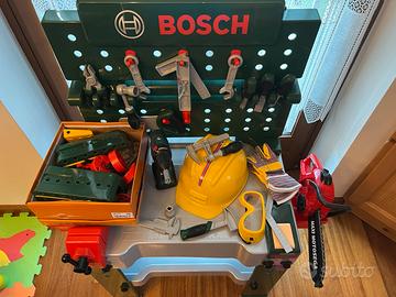 Banco da lavoro professionale bosh con atrezzi, casco , occhiali, guanti e pezzi per meccano in plastica con avvitatore funzionante. Aggiungo motosega finta. Spedisco solo mezzo poste italiane.