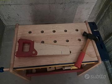 Banco da lavoro in legno. Comprensivo di perni,martello, sega ,bulloni ecc.