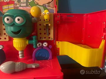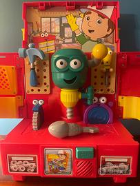 Banco da lavoro Manny tuttofare completo di attrezzi . Utilizzato poche volte , si presenta in buone condizioni . Due elementi da rilevare , delle macchioline marroni sul martello e macchie di penna sul piccolo adesivo che rappresenta Manny.