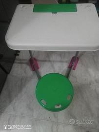 Piano d'appoggio: Bianco, con un inserto verde nella parte superiore. e uno sgabello verde con schienale removibile.