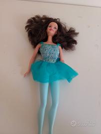 barbi ballerina con tutù azzurro e calze azzurre capelli castani scuro mossi