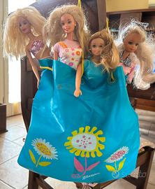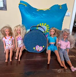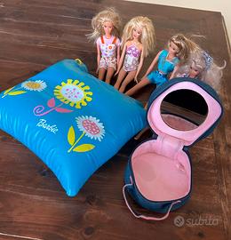 Due Barbie originali e due simili ,( beauty con specchio in jeans non Barbie ) con macchia all’interno ( visibile in foto) e borsa mare in plastica” Barbie” che si gonfia e diventa cuscino mare. Tutto discrete condizioni, tenendo conto che il tutto ha 20 anni . A una bambola manca di una scarpa TUTTO VISIBILE NELLE FOTO.