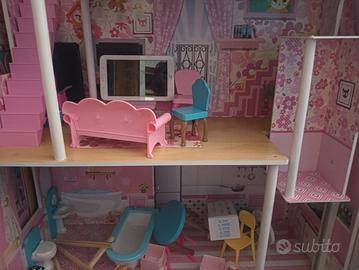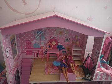 Casa di Barbie in legno completa di ogni accessorio montato a mano, ha l'ascensore ed è nuovissima, regalata a maggio per il compleanno a mia figlia ma non ci gioca, è praticamente intatta e non posso spedirla smontata purtroppo. La casa è alta almeno 1 metro e 40 e larga 1 metro. Molto bella e ben messa rifinita con dettagli e particolari bellissimi