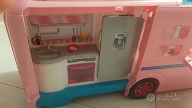 Vendo Barbie Dream Camper, originale e completo di numerosi accessori. Il camper si apre completamente e si trasforma in area campeggio con cucina, zona pranzo, bagno con doccia, camera da letto e piscina. Adatto dai 3 anni in su. Il giocattolo è usato ma in ottime condizioni completo e perfettamente funzionante.