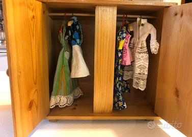 Barbie e Ken originali , armadio e cassettone in legno grezzo con disegni, diversi vestiti e accessori per Barbie piu una sorellina di Barbie non originale . Tutto in condizioni eccellenti
