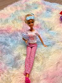 Bellissima bambola Barbie con pigiama rosa e azzurro, maschera da notte e un cuscino.