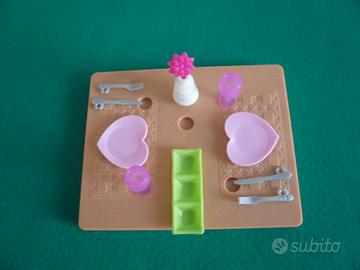 Vendesi kit Barbie per pranzare comprensivo di tavolo, sedie, piatti e posate, bicchieri, vaso con fiore, contenitore pietanze.