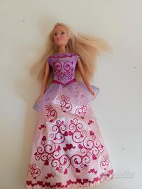 Barbie principessa con vestito viola e rosa con dettagli brillanti nati in buone condizioni ma non ha le scarpe e il vestito è un po' danneggiato