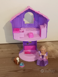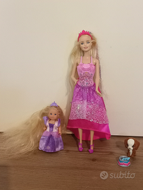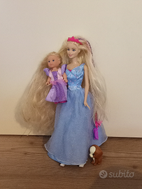 Una Barbie Rapunzel grande e una Barbie Rapunzel piccola con un cagnolino e una casetta accessoriata per Rapunzel piccola. Tanti cambi di vestiti e accessori vari per Rapunzel grande, Rapunzel piccola, e il cagnolino.