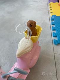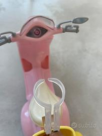 Lo scooter è davvero trendy in rosa e giallo con dettagli argentati. Puoi mettere Barbie seduta sulla sella che ha una clip che la sorregge.