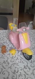Scooter della Barbie, colore rosa e giallo con cavalletto. Con supporto per mettere seduta la Barbie. Casco giallo e cestino posteriore per mettere il cagnolino.