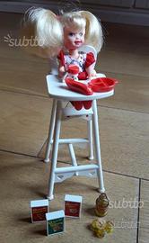 Barbie Shelly eatin'fun anni 90,in perfette condizioni e con tutti i suoi accessori,Ha il meccanismo che gli fà alzare il braccino x bere, perfettamente funzionante e il cucchiaino ha due calamite...quando viene avvicinato con una nuova la testa x dire no e con l altra si gira x mangiare ,dimostrato in foto