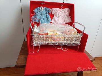Bambola che emette un vagito quando viene girata. Corredo composto da due vestitini con relative mutandine, camicia da notte, mutandine intime, calzini e scarpette.