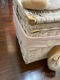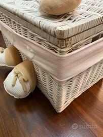 larghezza 66- profondità 38 altezza 39,5 in vimini intrecciato bianco di alta qualità, con forma rettangolare con copertura.