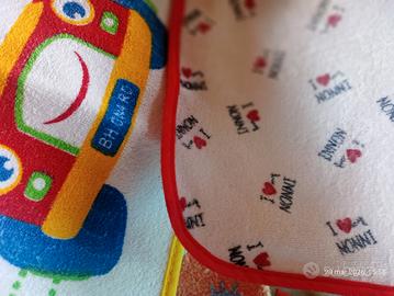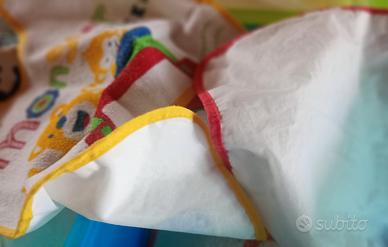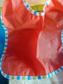 vendo bavaglie per bambini impegnati nello svezzamento. 3 in tessuto, con retro plastificato o cerato e 2 completamente in plastica lavabili velocemente e riutilizzabili (le ultime foto, arancione e verde).