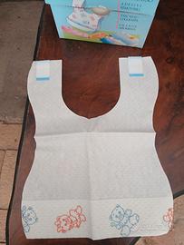 10 bavaglini monouso marca Chicco, mai usati, grande assorbenza, tascaraccogli pappa, adesivi removibili, come da foto, la scatola e' a