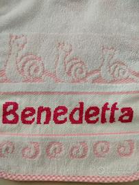 Bavaglino ricamato a punto croce con il nome Benedetta.