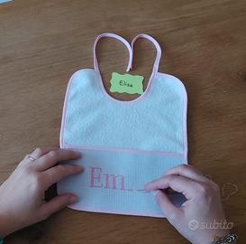 Bavaglino nascita neonata con nome EMMA ricamato a mano con la tecnica del punto croce.