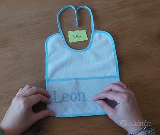 Bavaglino nascita neonato con nome LEONARDO ricamato a mano con la tecnica del punto croce.