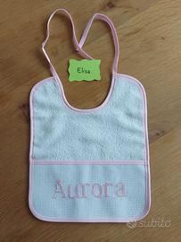 Bavaglio nascita con nome AURORA ricamato a mano con la tecnica del punto croce. Fatto a mano da me. Misura 21x26 Chiusura con laccetti. Cotone.