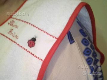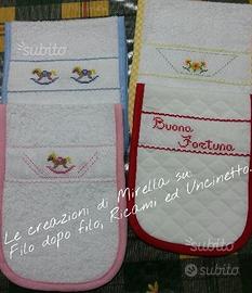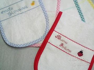 Vendo bavetta "salva spalla" x la mamma. Utile durante la fase digestiva del neonato. La bavetta e' realizzata interamente a mano in spugna e ricamata a punto croce. E' personalizzabile nel colore , nella scritta e nel disegno.Il prezzo è di 13 euro uno. 2 pezzi 25 euro. Per altri miei lavori visitate la mia pagina facebook " Filo dopo filo ; Ricami e Uncinetto "