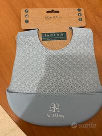 •Bavaglino in silicone morbido della MIZU: morbido ,facile da togliere e indossare,chiusura regolabile, facile da arrotolare e soprattutto facile da pulire. Tasca frontale e struttura curva permettono di raccogliere il cibo che cade dalla bocca…niente piu cibo o briciole sul seggiolino/pavimento.