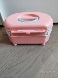 Splendida valigetta per bambine firmata Chicco, un vero pezzo vintage in ottime condizioni! Il set è caratterizzato dall'iconico design arrotondato nei colori rosa pastello e azzurro, con una chiusura frontale a forma di farfalla.