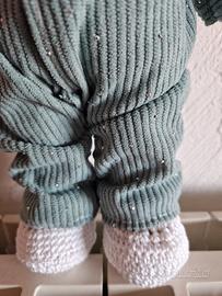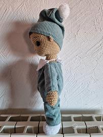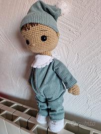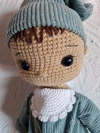 Bambola Bebè Lucas realizzata all'uncinetto, perfetta per i più piccoli. - Realizzata a mano con filato di cotone. - Dettagli ricamati sul viso. - Indossa un pigiamino con dettagli glitterati e cappellino con pompon. - Bavaglino e babbucce bianche. - Bebè e vestiti fatti a mano.