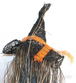 Particolare STREGA/BEFANA realizzata da artigiani locali a Castelrotto Alpe di Siusi-Bolzano all'inizio degli anni 90. Volto in legno intagliato e decorato a mano da artista del luogo. Copricapo in tessuto nero rigido e intrecciato. Scialle in tessuto intrecciato marrone. Realizzato completamente a mano con elementi naturali del posto.
