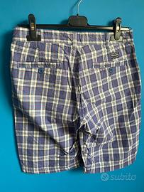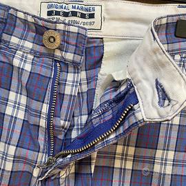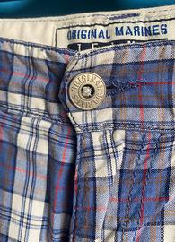 Bermuda ragazzo 5 tasche in cotone a quadri bianchi, blu chiaro e azzurri con riga rossa Original Marines, misura 12 anni. Zip e bottone davanti in metallo finitura argento; bottoni siglati in plastica alle tasche posteriori; patch blu logo alla tasca
