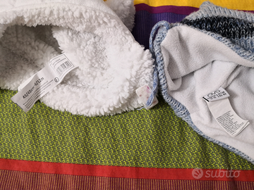 Set berretto+scaldacollo+guanti/manopole misura 47 vendo a 5 euro. 2 berretti con laccetto da stringere sotto il collo misura 46/48 indicativamente dai 6 mesi vendo a 2 euro ciascuno. Berretto manca Datch misura S vendo a 2 euro. Totale 10 euro.