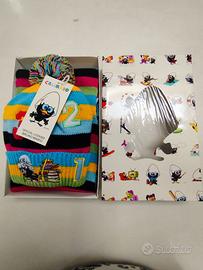 Set di berretto e sciarpa a righe per neonati realizzati a maglia, art. CLI002. Berretto con risvolto, applicazione in tessuto. Composizione: 100% acrilico. Colori: righe multicolori. Nuovo con etichetta e in confezione regalo.
