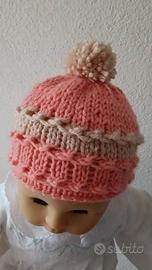 Berrettino realizzato ai ferri. Rosa e bianco. Materiale: acrilico. Lavaggio: 30° Handmade