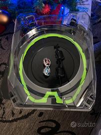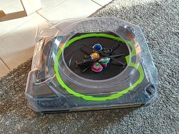 TUTTO CIÒ CHE SERVE PER GIOCARE: include il necessario per gareggiare, ovvero 2 trottole con rotazione destra, 2 lanciatori con cavo per il lancio e Beystadium (43,8 x 35,5 cm) Assembla l'arena e le trottole, carica il lanciatore, pronti... lancio